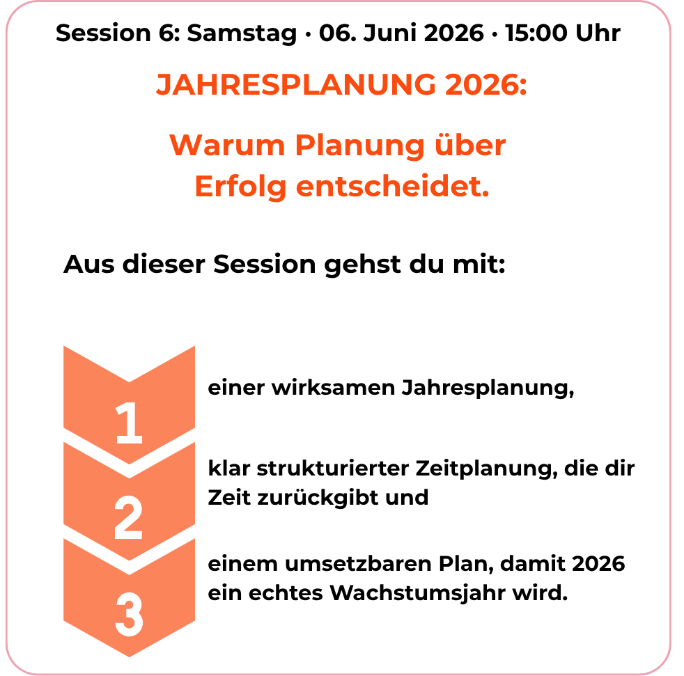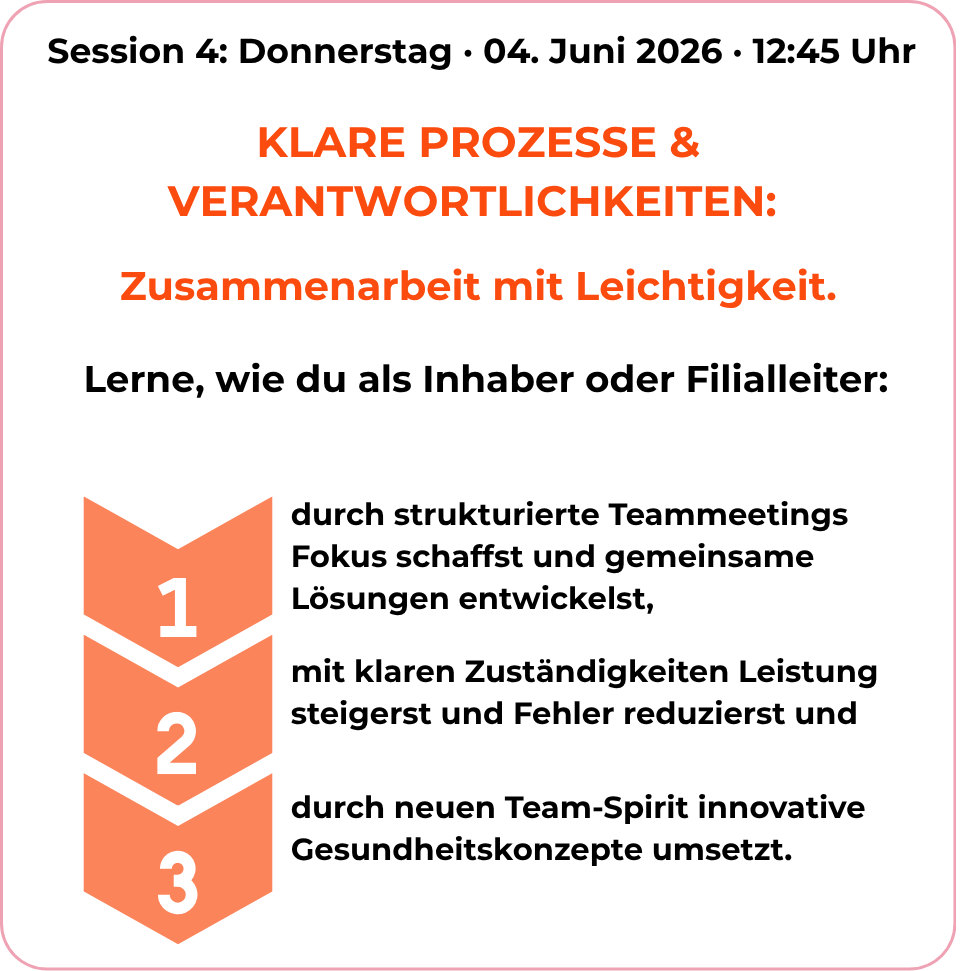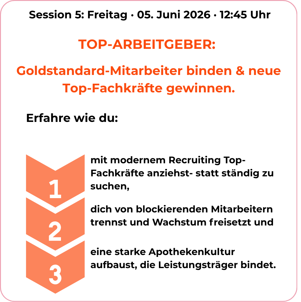 In täglichen Sessions von Montag bis Freitag um 12:45 Uhr sowie am Samstag um 15:00 Uhr teile ich meine Erfolgsformeln zu Themen wie Apothekenzukunft, Mitarbeiterführung, Recruiting, moderne Kundenbindung, betriebswirtschaftliche Maßnahmen und Work-Life-Balance. Jede Session dauert ca. 60 Minuten und bietet dir direkt umsetzbare Tipps.