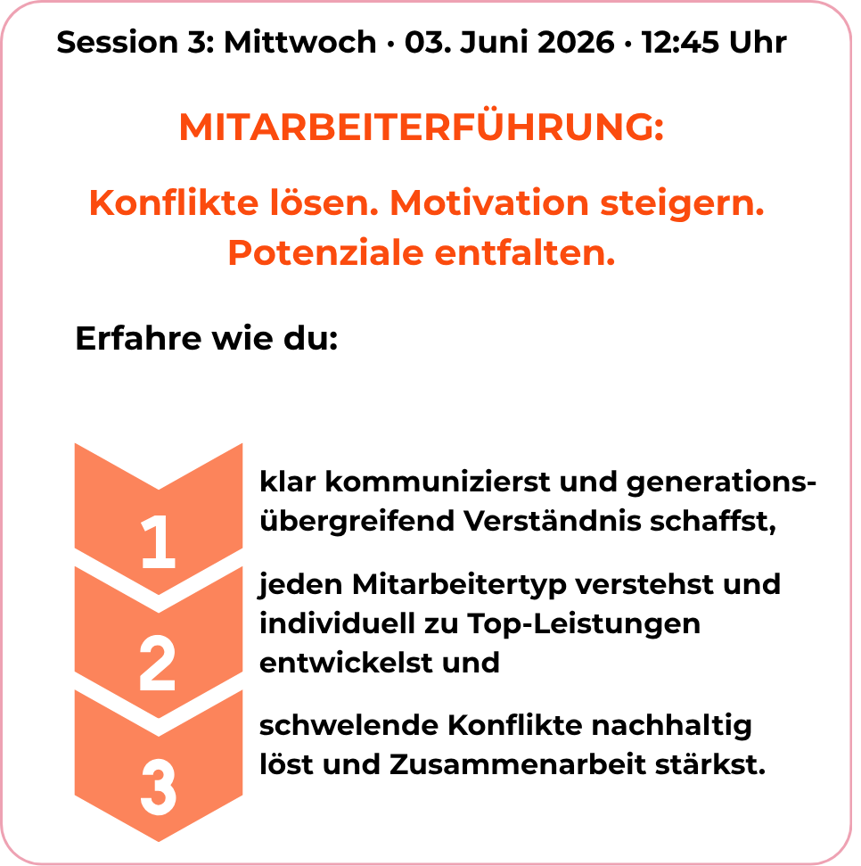 Wenn du bereit bist, gezielt Zeit zu investieren, um einen bewährten Führungs- und Mindset-Prozess zu übernehmen, der dir mehr Klarheit, strukturierten Handlungsspielraum und spürbare Entlastung in deiner Führungsrolle bringt, dann lohnt sich das absolut!