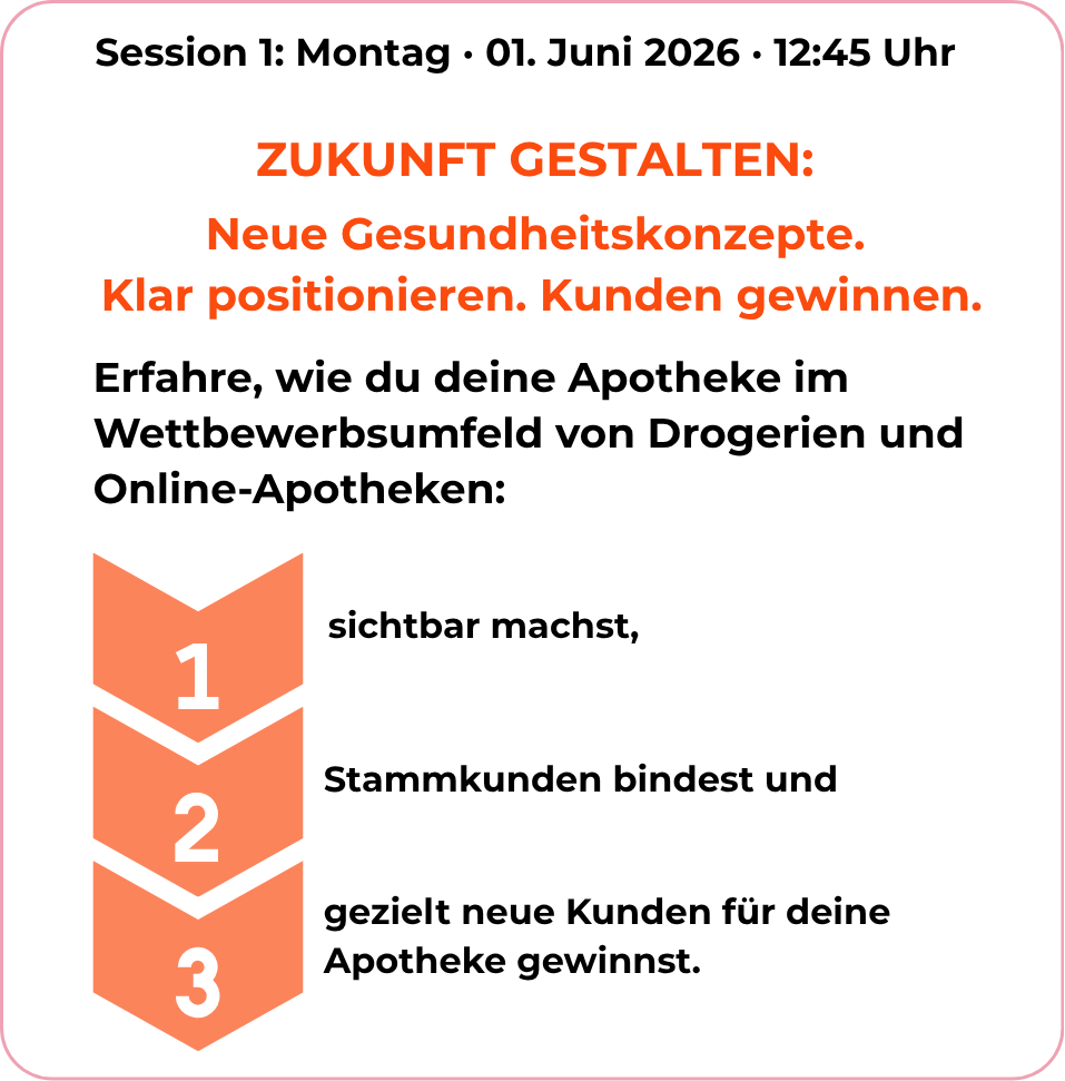 Die Lunch & Learn-Sessions werden dich und dein Team so stärken, dass ihr aktiv den Apothekenwandel gestaltet, neue Chancen nutzt und mit Freude in ein erfolgreiches Apothekenjahr 2026 startet.